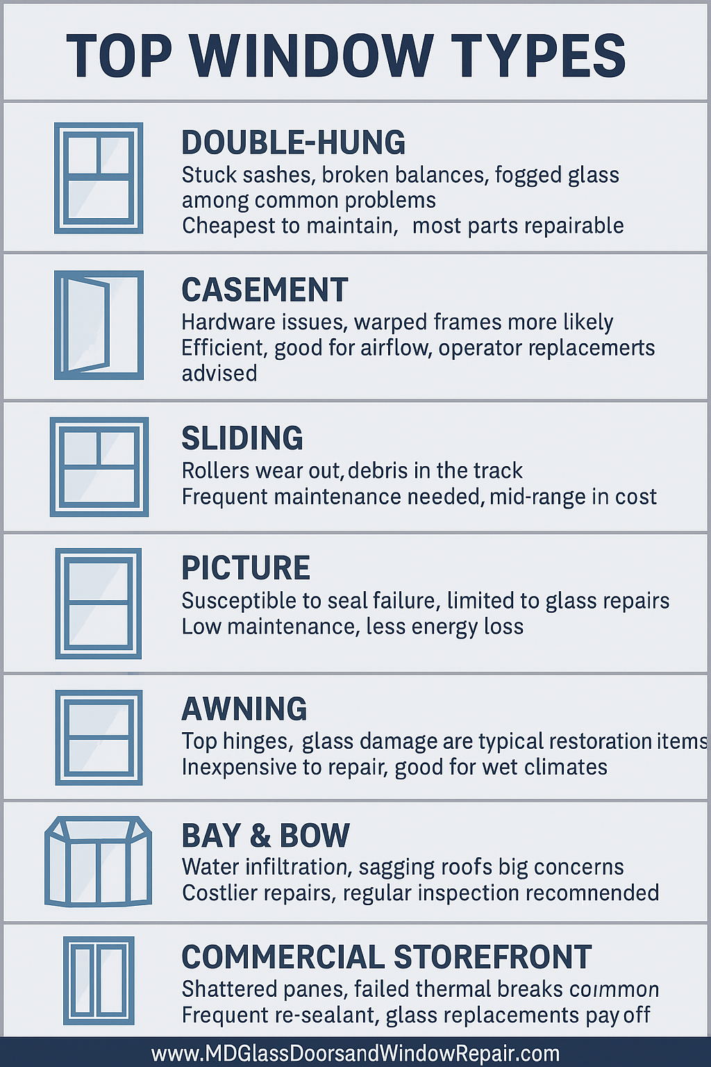 In homes from Takoma Park bungalows to Bowie town centers, and in businesses stretching from Rockville Pike to the Route 1 corridor, windows are more than glass—, they’re the silent partners that shape indoor comfort, energy bills, and first impressions. When shoppers call us, seven window styles dominate the conversation: double‑hung, casement, sliding, picture, awning, bay‑and‑bow, and commercial storefront systems. Understanding how each performs in Maryland’s humid summers, icy snaps, and daily pollen storms can save thousands over the life of a property. Below, we break down what Marylanders ask most, the hidden pain points, and which options prove cheapest to maintain.